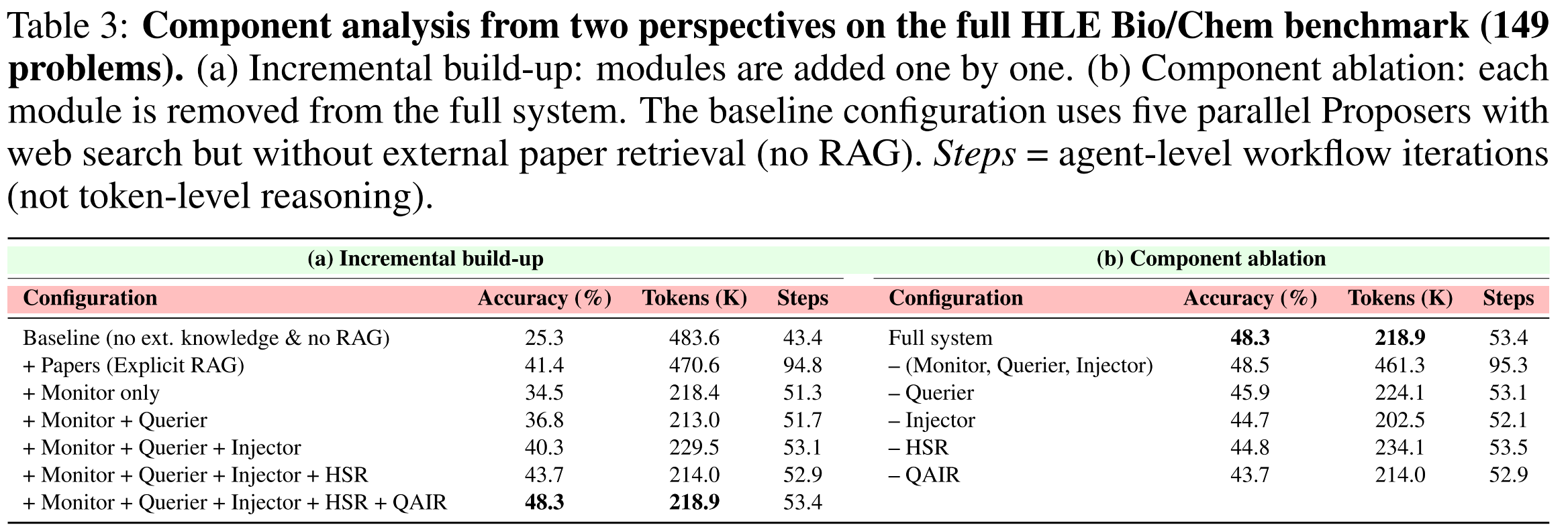 Our analysis on HLE Bio/Chem revealed that knowledge gaps and reasoning failures co-occur in 85 % of cases, showing that knowledge integration and reasoning continuity must be solved together.