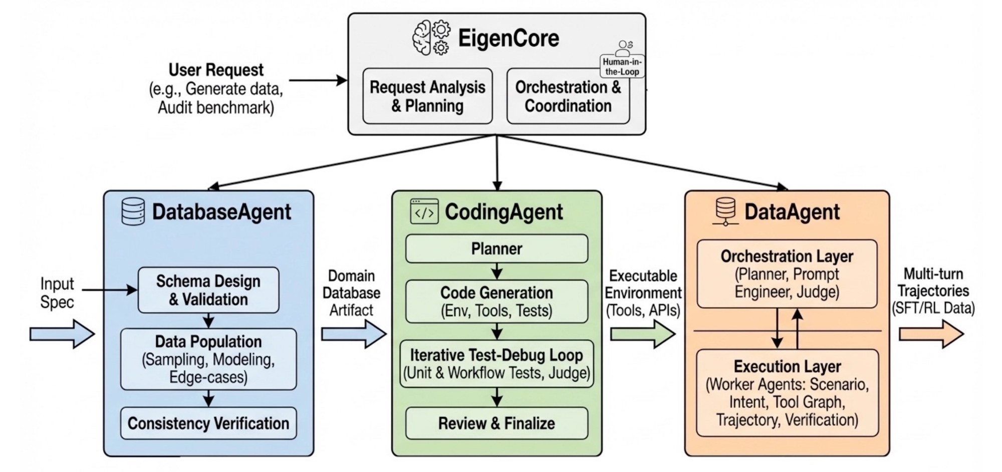 To address these issues, EigenData applies a component-wise repair pipeline, coordinated by EigenCore: