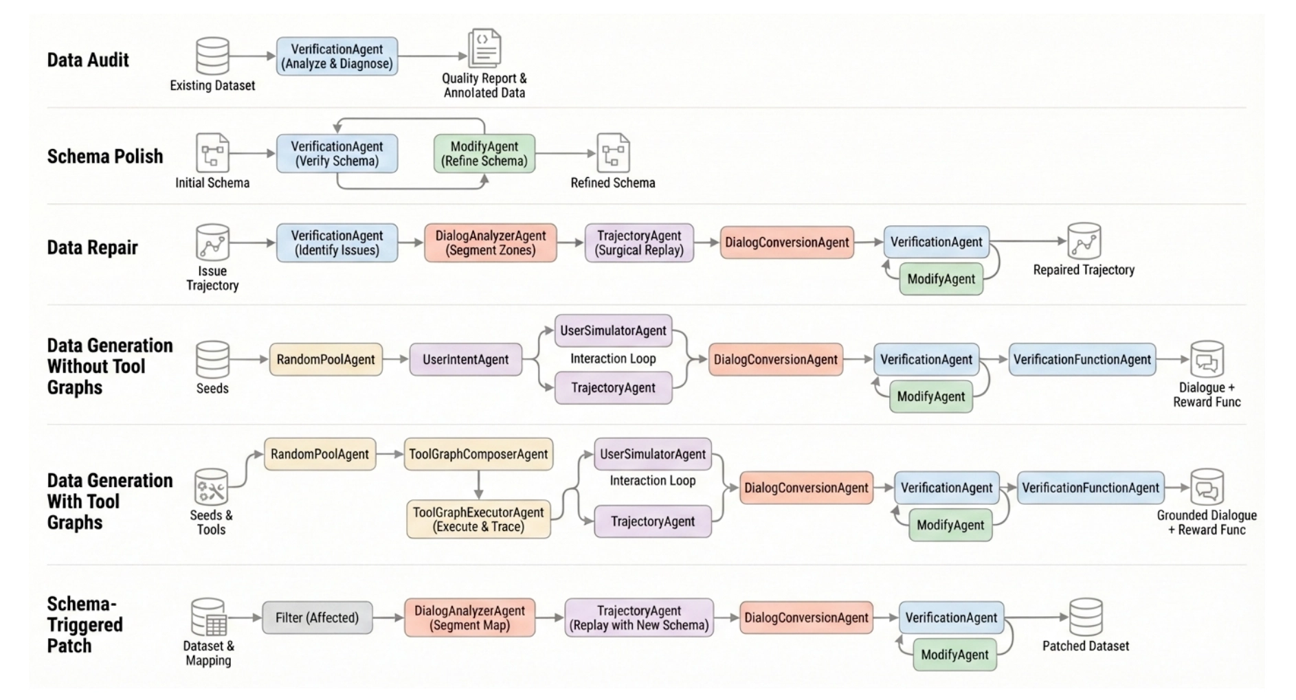 Rather than regenerating full trajectories, EigenData performs targeted, agent-driven repair through verification–modification loops, enabling localized fixes to schemas, implementations, and trajectory segments.